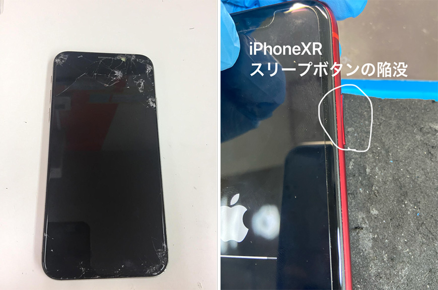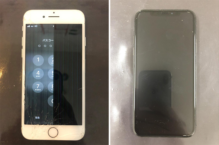 左写真のiPhoneは、水溜りに落としたことで画面半分が暗転してしまったものです。内部全体に浸水はしなかったものの、ひび割れ部分を中心に浸水したことで一部が暗転したことが予想されます。