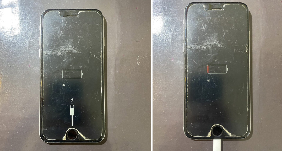 一方、右写真のiPhoneは浴槽に完全に水没させたことで再起不能になったものです。浸水範囲が広いと内部の電子回路上でショートを起こすことがあり、その場合は電源が入らなくなることが大半です。