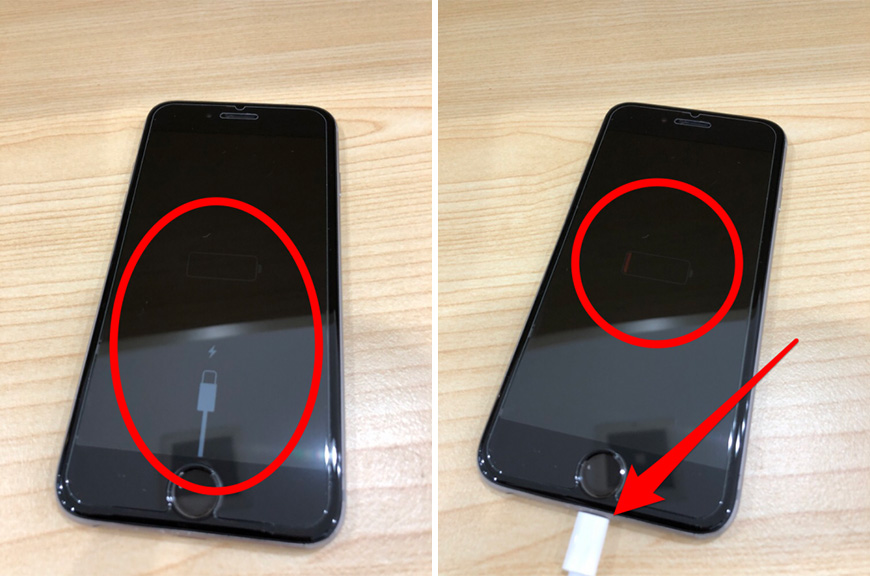 充電ケーブルを接続してすぐに空のバッテリーマークが表示されるようであれば、バッテリー切れを起こしています。バッテリーマークが表示されない場合も、30分程度充電しておくと電源が入るケースが多いです。