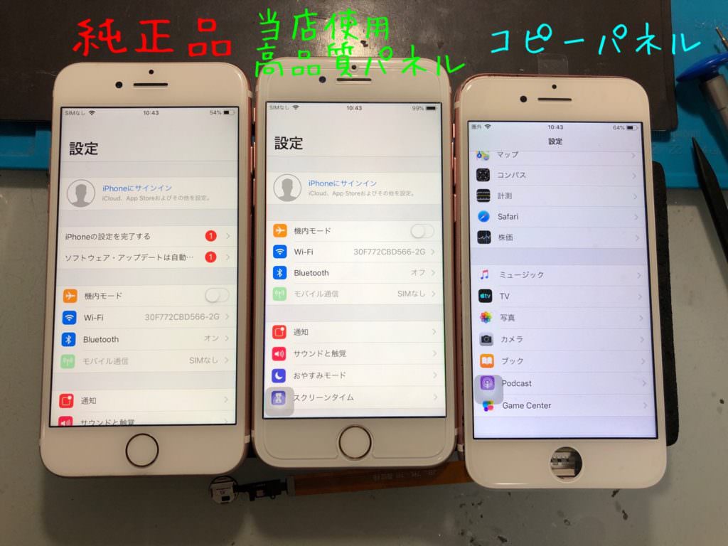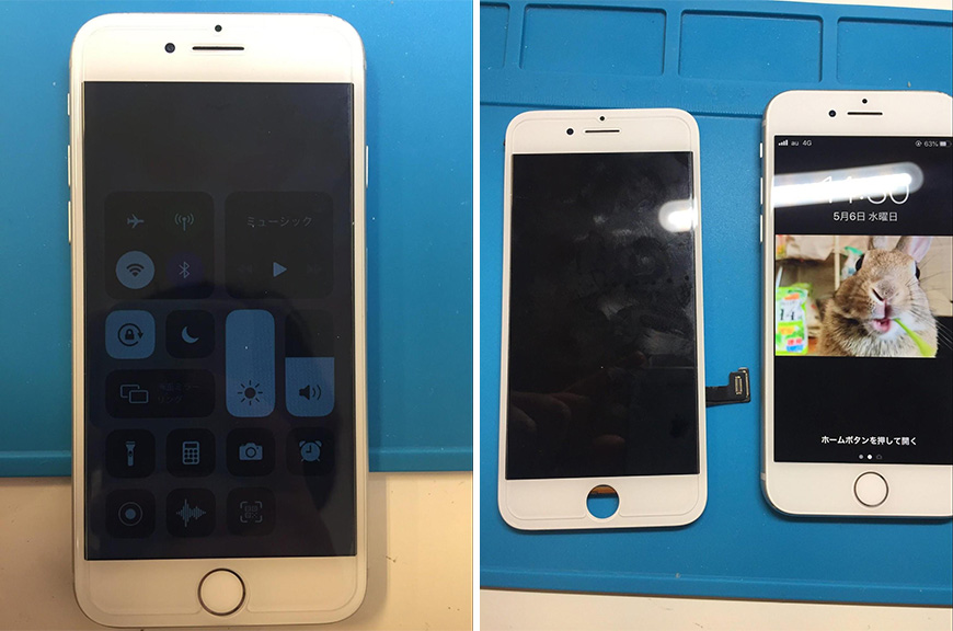 iPhoneの画面は「液晶」と「有機EL」の2種類があり、上記モデルはいずれも液晶画面を採用したモデルです。液晶画面を正しく映し出すにはバックライトが必須(有機ELは不要)であるため、故障すると写真のように何をしても薄暗い画面になってしまいます。