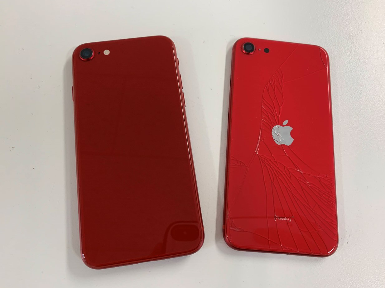 こちらのiPhone SEは、背面中央から下部に細かくひび割れが広がっている状況でした。