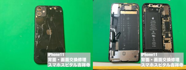 写真:水没で腐食が見られた背面ガラス割れiPhone 11(スマホスピタル 吉祥寺店)