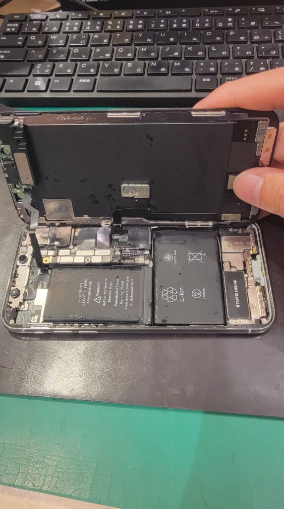 iPhone Xは画面を持ち上げて内部作業を行う構造です。内部には細かなケーブルやコネクタが多く、無理な作業は破損の原因になります。