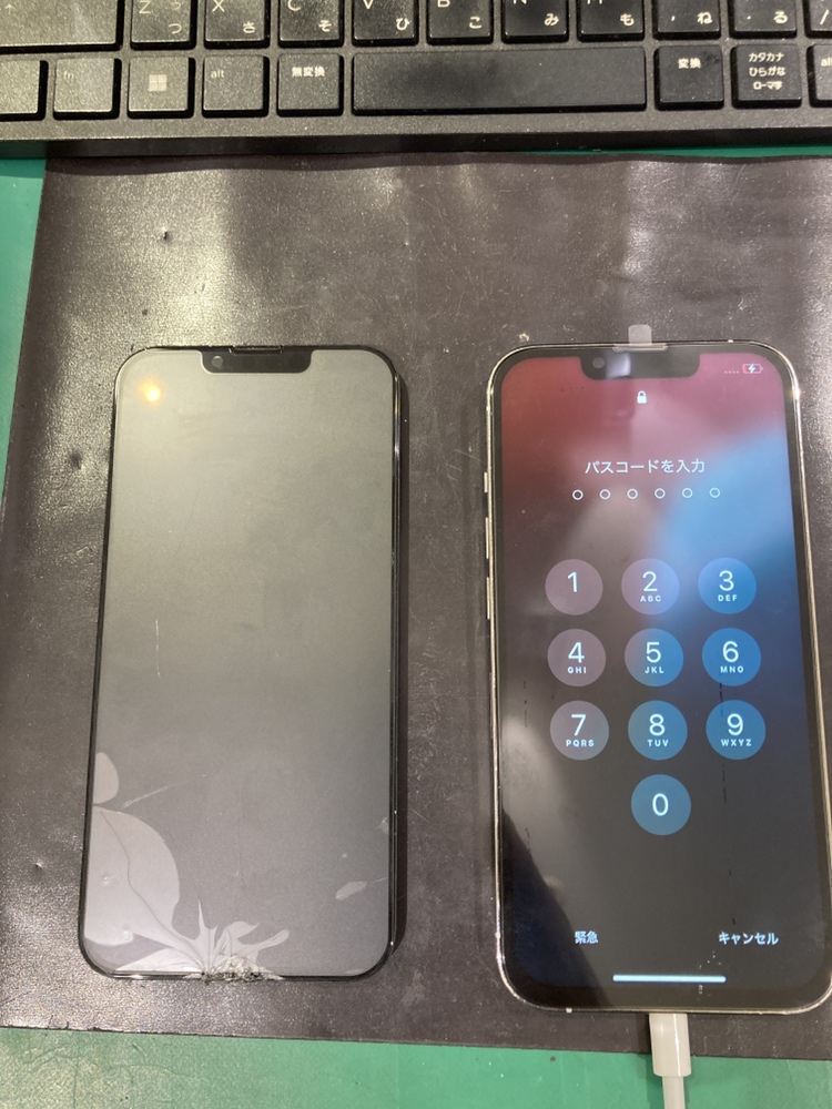 特にiPhone 13 Proは高精度なFace IDやセンサーが搭載されているため、画面の破損が機能に影響を与えることがあります。そのため、画面交換による修理を推奨しました。