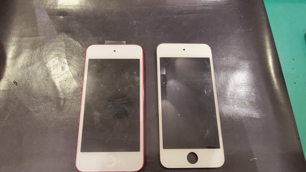 iPod touch第7世代の画面交換修理では、破損したフロントパネルを取り外し、新しい画面パーツへ交換します。
