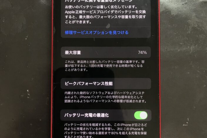 今回の端末は最大容量が74%なので、バッテリーが劣化していることが分かりますね😢