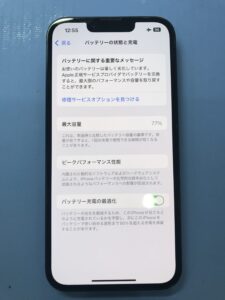 バッテリー最大容量を確認させていただくと、77%の表記でかなりバッテリーへの蓄電容量が減ってしまっているようです。