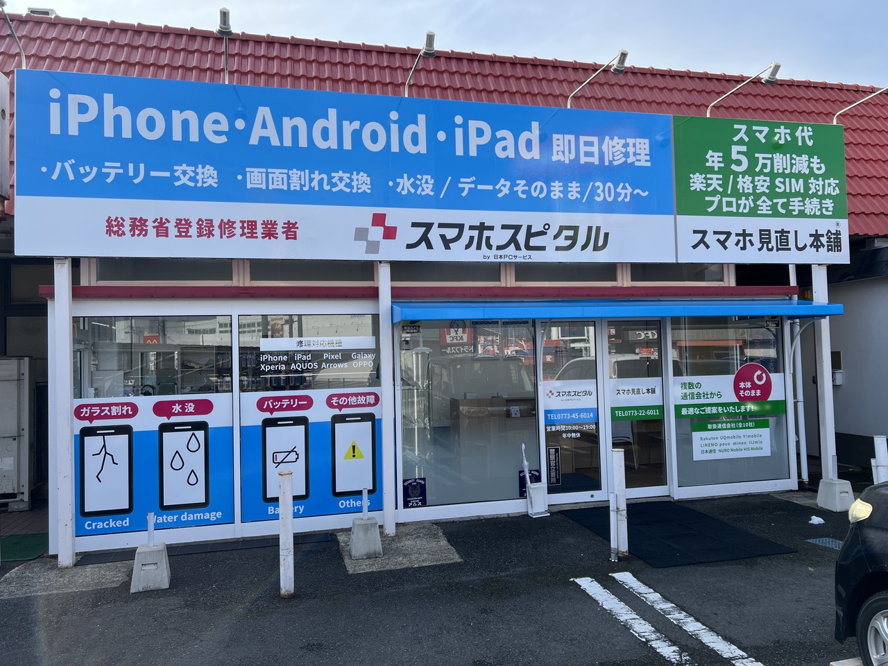スマホスピタル福知山店は、福知山市堀の業務スーパー横、マクドナルド前という分かりやすく立ち寄りやすい場所にあるスマホ修理専門店です。お買い物やお食事のついでにも利用しやすく、駐車しやすい立地で地域の皆さまにご利用いただいています。