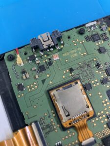 背面パーツを外し、内部の基板にアクセスして充電口部分をチェック。