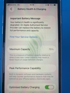 バッテリーの最大容量を確認してみますと75%となっておりました。