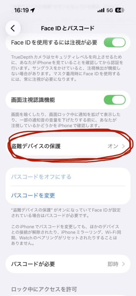 [設定] > [Face IDとパスコード] > [盗難デバイス保護] のオンオフ切り替え画面)