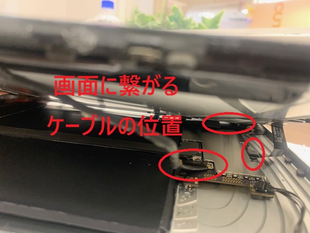 画面部品が上手いコト外せたら、内部でケーブルが3本繋がった状態なので、断線させないように隙間からケーブルを外していきます。