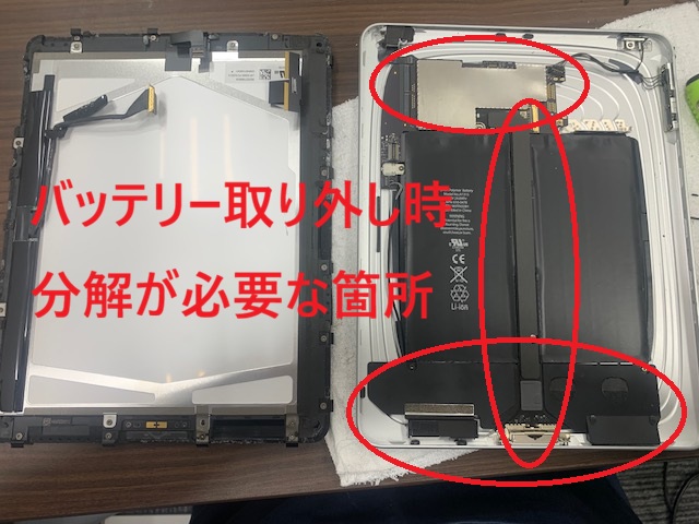 後はバッテリーを取り外すだけですが、他の機種と違って、基板や充電口部品、ラウドスピーカーなど、ほぼ全ての部品を取り外さないとバッテリーの交換はできないので、ちょっと手間がかかります。