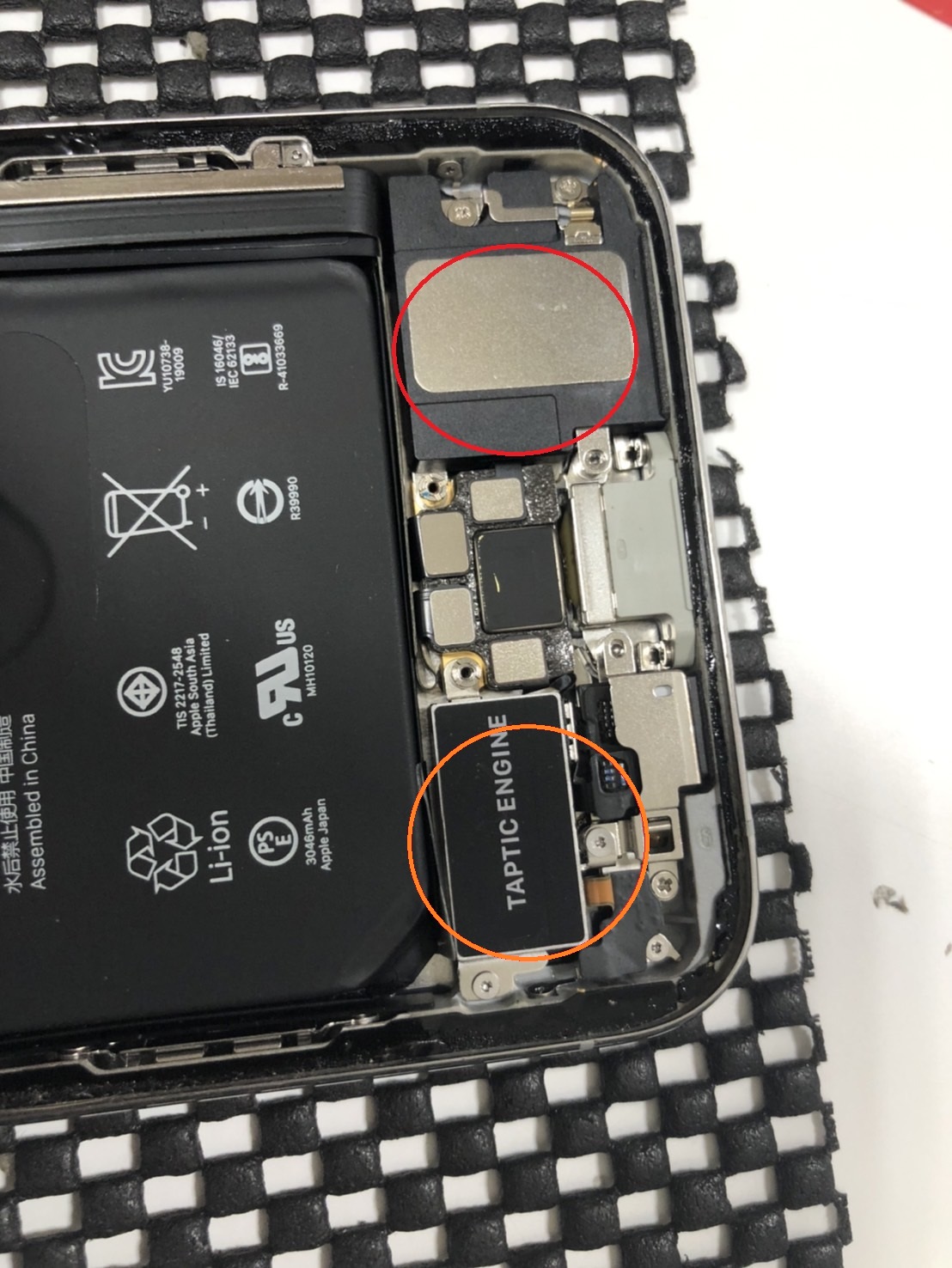 ドックコネクターケーブルの上にある各パーツ。スピーカー(赤)やバイブレーター(オレンジ)等です。