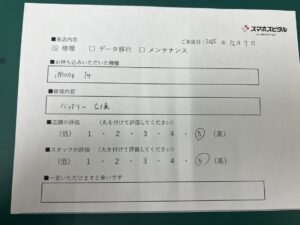 スマホスピタル京橋 【お客様の声】iPhone 14のバッテリー交換のお客様にお声をいただきました。