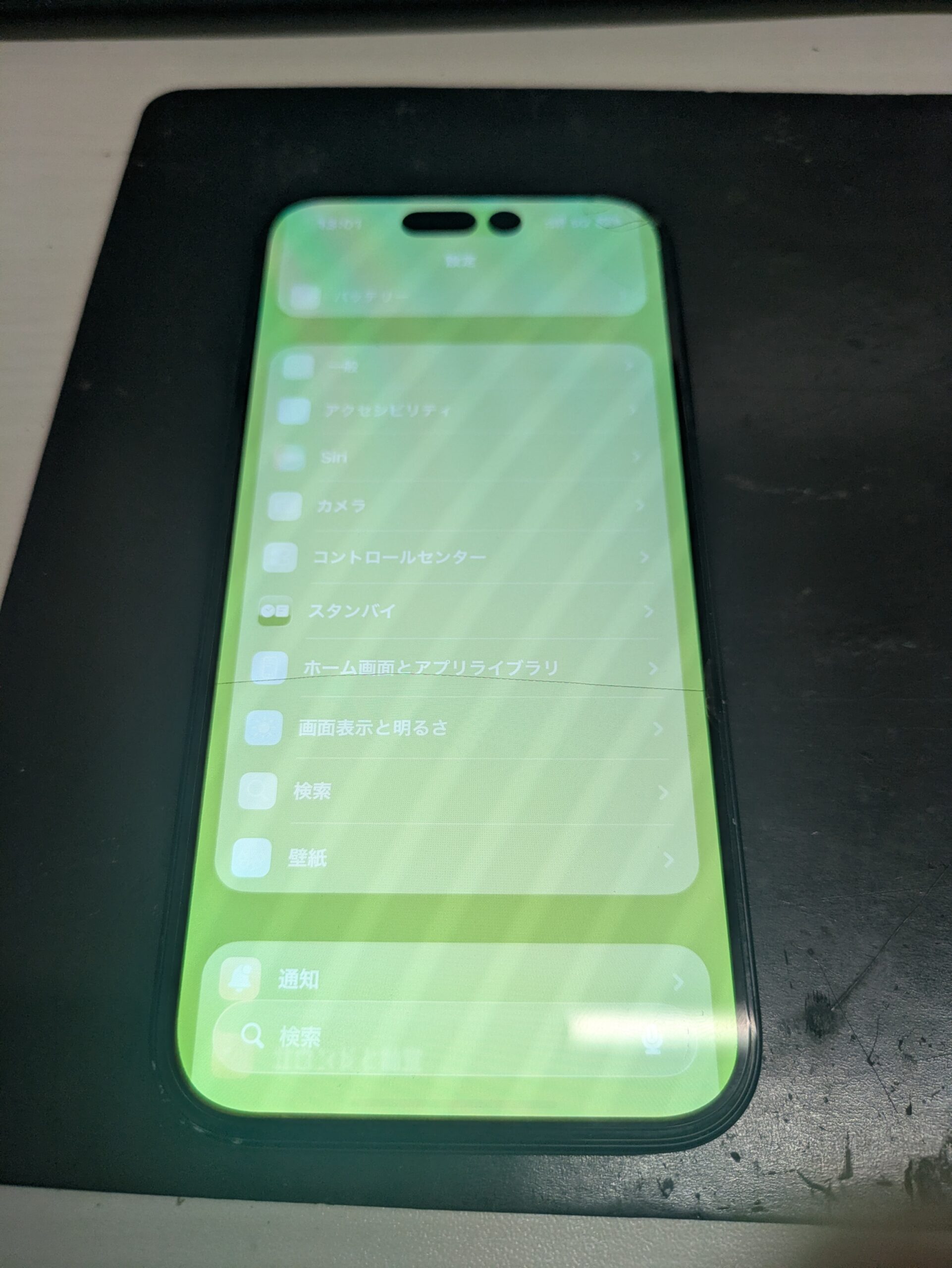 今回は、iPhone15の画面破損によって画面全体が緑色に変色してしまった症状の修理事例をご紹介します。
