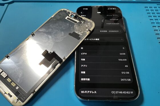 落下衝撃で画面割れしていたiPhone16、液晶までダメージが出現したためディスプレイ交換修理