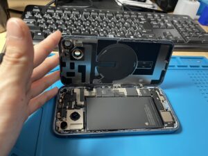 iPhone14 Plusは背面開けで、強力な接着がされているので配線を断線させないように丁寧に開いていきます。