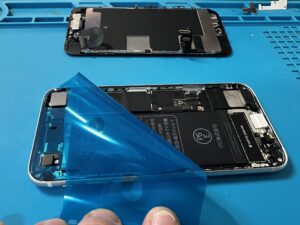 ここで傷んだ古いバッテリーを摘出。Qi置くだけ充電のパーツを避けるように、新品を固定するテープを貼りつけます。