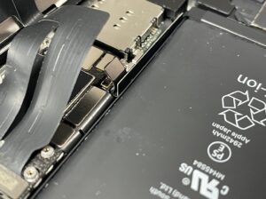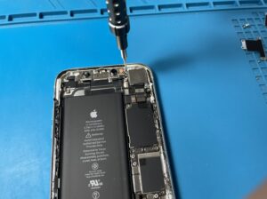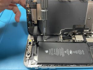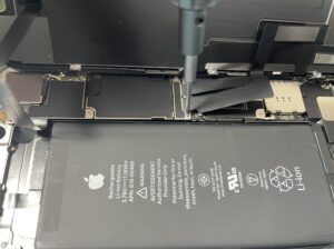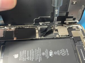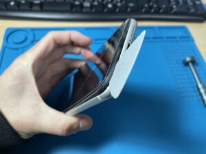 iPhone XRは画面開けで、配線を断線させないようにピックなどを挟み丁寧に横開きしていきます。