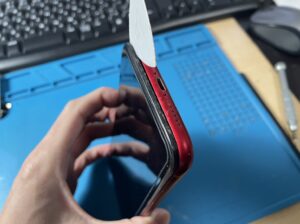 iPhone XRは液晶開けで配線を断線させないように、小さな隙間を作りピックをスライドするように丁寧に開いていきます。