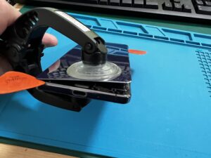 背面を温めて丁寧に開いていきます。電源ボタンとボリュームボタンの配線を切らないように慎重に開いていきます。