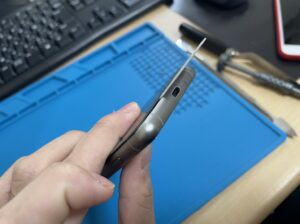 背面を温めて丁寧に開いていきます。電源ボタンとボリュームボタンの配線はありませんが、上部カメラ付近に強めの粘着がついているのでカメラを傷つけないように慎重に開いていきます。