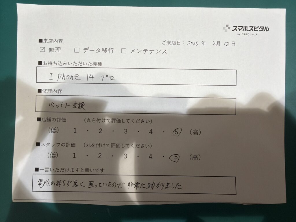 iPhone14Proのバッテリー交換でご依頼いただきました!