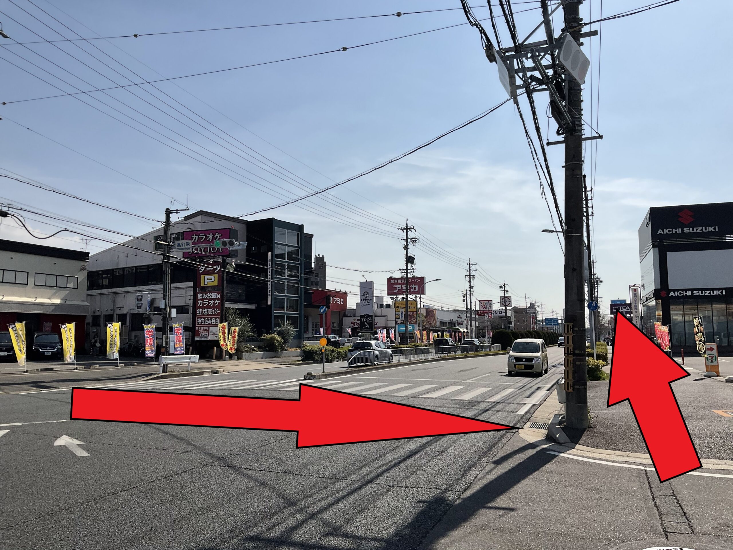 バス停下車後、エディオン、カラオケJOYJOYの方向に向かって歩きます。エディオン、カラオケJOYJOY側の歩道に下車した場合はカラオケJOYJOY前の交差点をセブンイレブン側に渡り、愛知スズキの先に進みます。