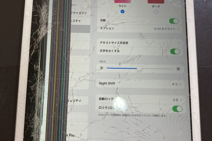 お預かりしたiPhone11Proは画面割れが起こり、液晶下部には黒いシミ(液晶漏れ)が表示されていました。