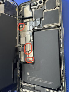 ショートを防ぐために初めにバッテリーの接続を外し、画面とフロントセンサーの接続も外していきます。