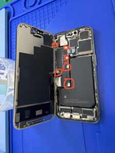 ショートを防ぐために初めにバッテリーの接続を外し、画面とフロントセンサーの接続も外していきます。