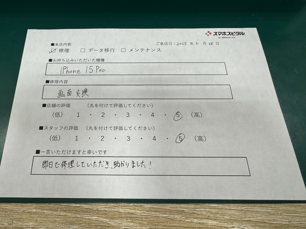iPhone15Pro 画面交換のお客様から頂きました。