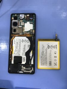 わかりづらいですが充電マークがついている方がご用意頂いた中古端末です。こちらに故障した元端末から基盤を移植していきます!