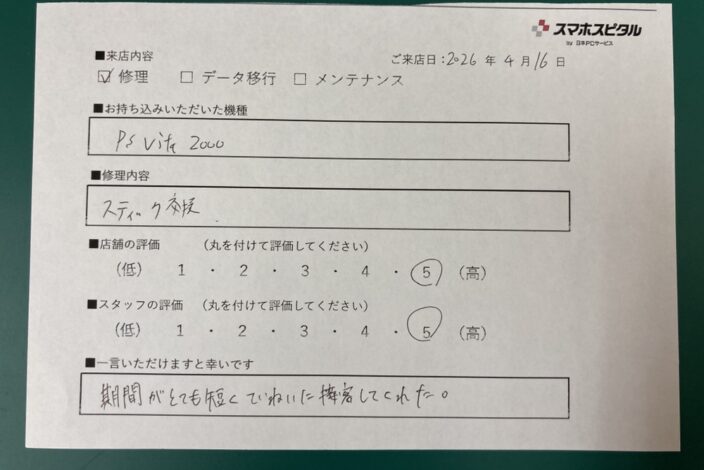 機種や修理箇所により異なりますが、最短15分から対応しています。目安としては30分~1時間弱で修理完了するものが多いです。