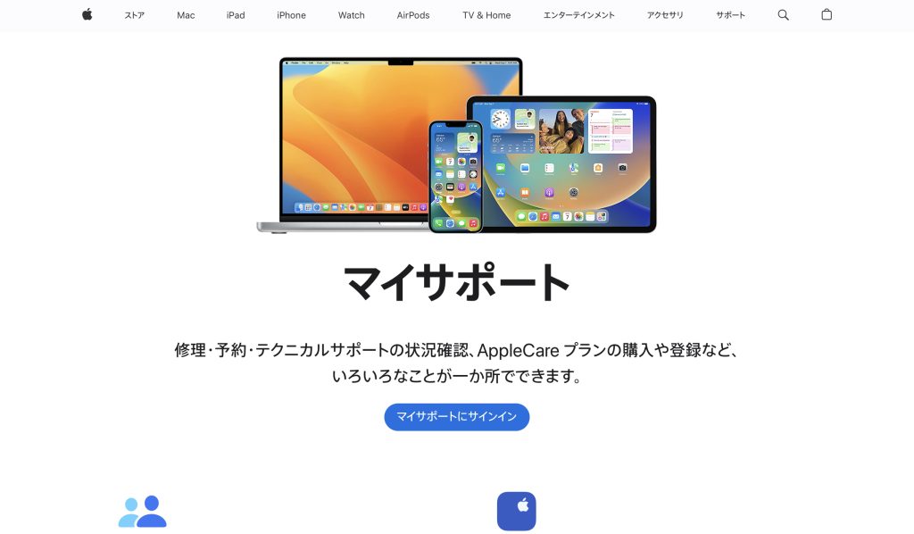 AppleのHPを開き、「サポート」→「マイサポート」と進むと下記のページにたどり着きます。