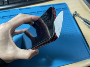 iPhone XRは液晶開けで配線を断線させないように、小さな隙間を作りピックをスライドするように丁寧に開いていきます。