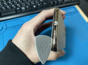 iPhone 11Proは液晶開けで配線を断線させないように、小さな隙間を作りヘラで粘着を外すように丁寧に開いていきます。