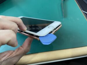 左側面にフロントセンサーとtouch IDの配線が通っているので切らないように丁寧に開いていきます。バッテリーコネクタを先に外し、絶縁します。先に絶縁しないとショートしてしまう恐れがあるので必ず行います。