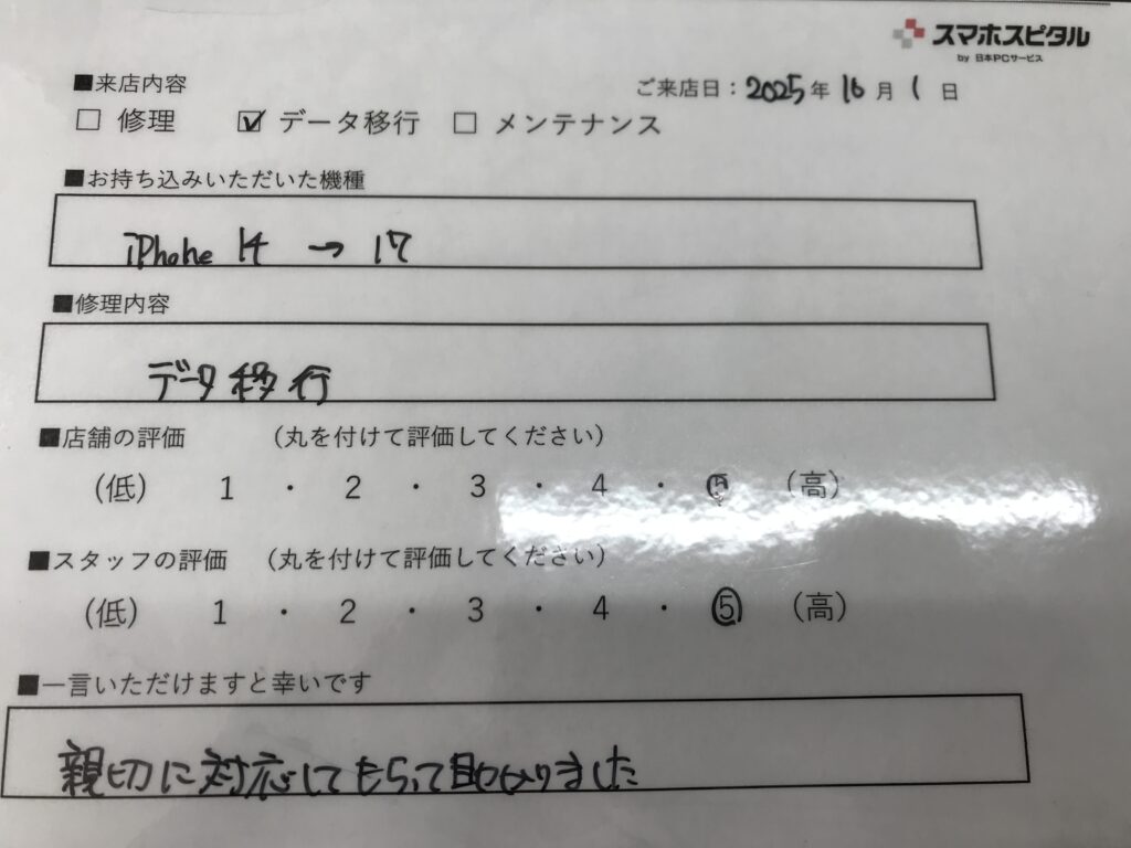 スマホスピタル 大阪梅田 【お客様の声】吹田市よりお越しのお客様iPhone14からiPhone17へデータ移行をさせていただきます。