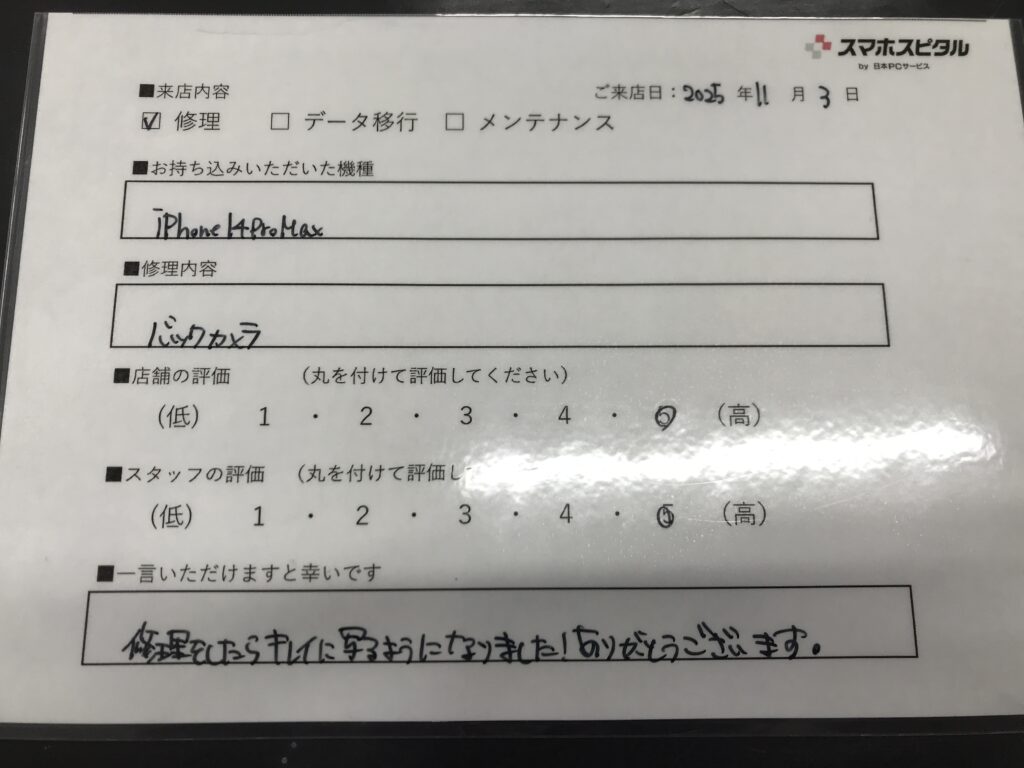 スマホスピタル 大阪梅田 【お客様の声】大阪市よりお越しのお客様iPhone14ProMaxバックカメラ交換修理をさせていただきました。