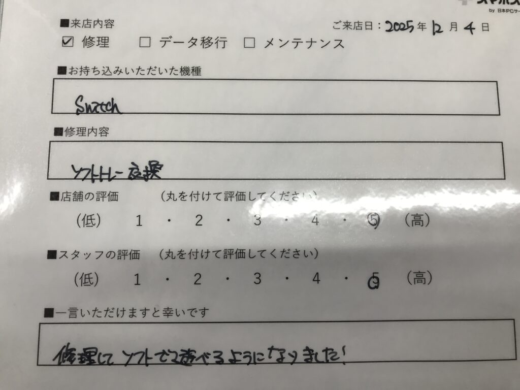 スマホスピタル 大阪梅田 【お客様の声】大阪市よりお越しのお客様Switchソフトトレー交換修理をさせていただきました。