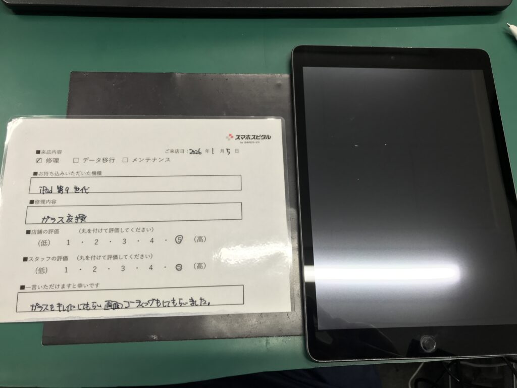スマホスピタル 大阪梅田 【お客様の声】大阪市よりお越しのお客様iPad第9世代ガラス交換修理をさせていただきました。