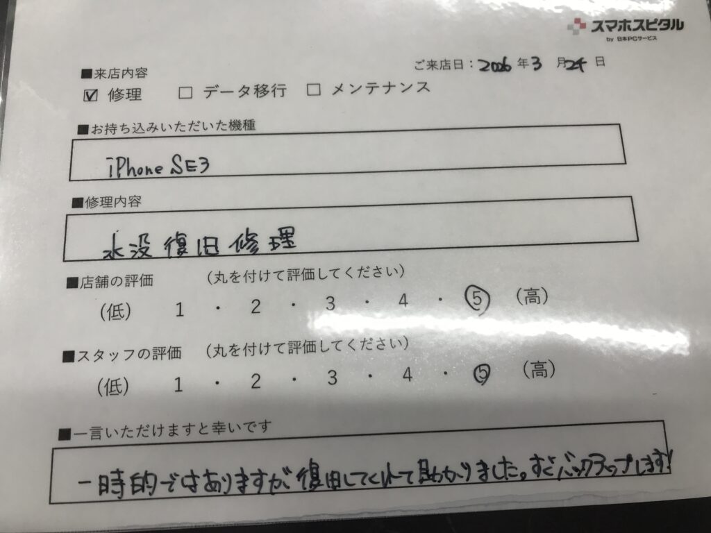スマホスピタル 大阪梅田 【お客様の声】東大阪市よりお越しのお客様iPhoneSE3水没復旧修理をさせていただきました。