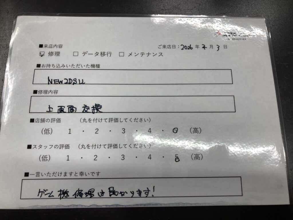 スマホスピタル 大阪梅田 【お客様の声】大阪市よりお越しのお客様NEW2DSLL上画面交換をさせていただきました。
