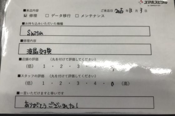 【お客様の声】摂津市よりお越しのお客様Switch液晶交換修理をさせていただきました。
