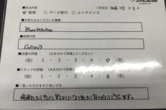 【お客様の声】大阪市よりお越しのお客様iPhone14ProMaxバックカメラ交換修理をさせていただきました。