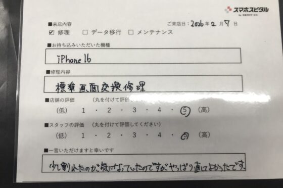 【お客様の声】大阪市よりお越しのお客様iPhone16画面交換修理をさせていただきました。