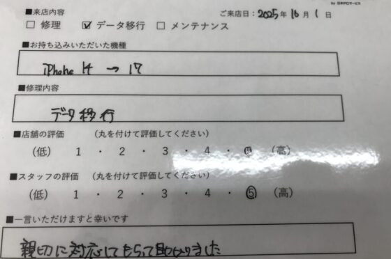 【お客様の声】吹田市よりお越しのお客様iPhone14からiPhone17へデータ移行をさせていただきます。