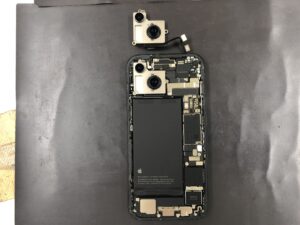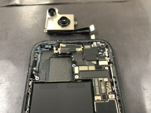 こちらはiPhone14のカメラアプリを起動しても画面が真っ暗でカメラが使えない。とお問合せ頂きお持込みとなりました。写真の様にカメラアプリは起動しているのですが、画面が真っ暗。この様な症状はカメラ本体の故障によるものになります。中のカメラ自体を交換することで改善致します。